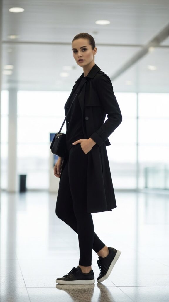 A classic trench coat over casual basics is that timeless airport look that never misses. It’s sophisticated without trying too hard, and it works for literally any season.