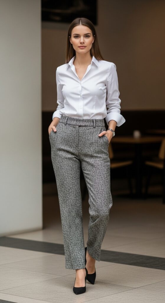 Listen, you can never go wrong with a white button-down and tweed trousers. It’s like the little black dress of daywear, sophisticated without being stuffy. The contrast between the clean white and the textured tweed? Chef’s kiss.