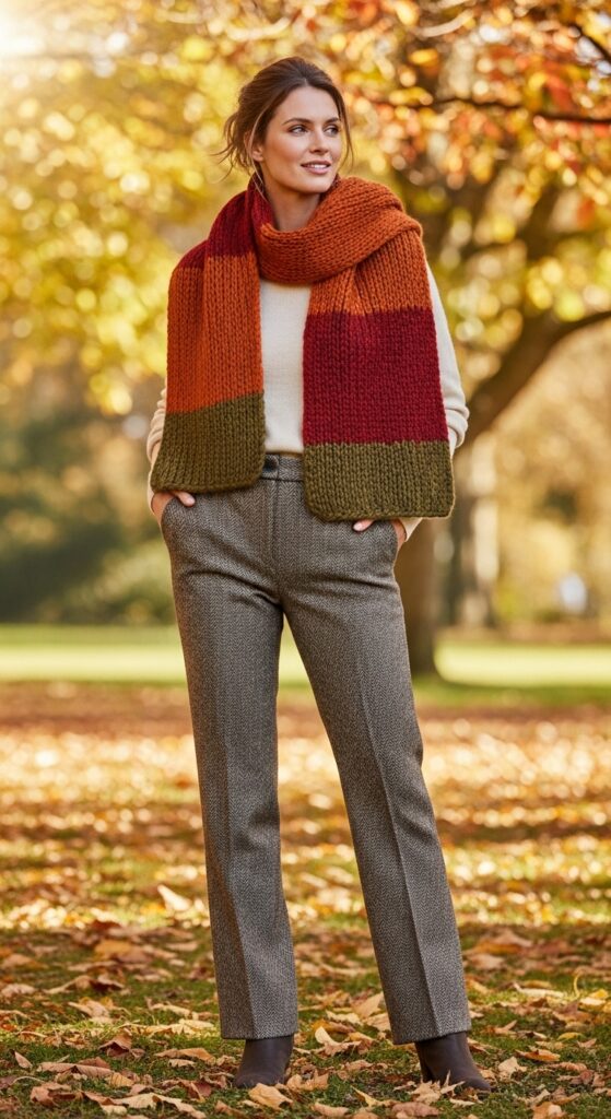 Never underestimate the power of a gorgeous scarf. Drape an oversized scarf over your tweed trousers outfit for instant warmth and style points. We’re talking big, cozy scarves in complementary plaids, solids, or even fun patterns.
