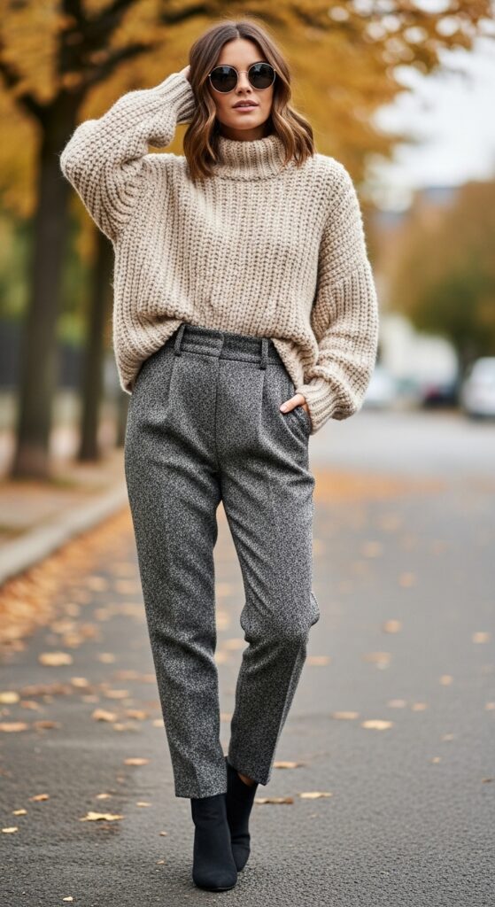 Is it even fall if you’re not living in oversized knits? This combination is peak cozy-meets-sophisticated, and I’m here for it. Pair your tweed trousers with a chunky cable-knit sweater in cream, camel, or even a soft sage green.