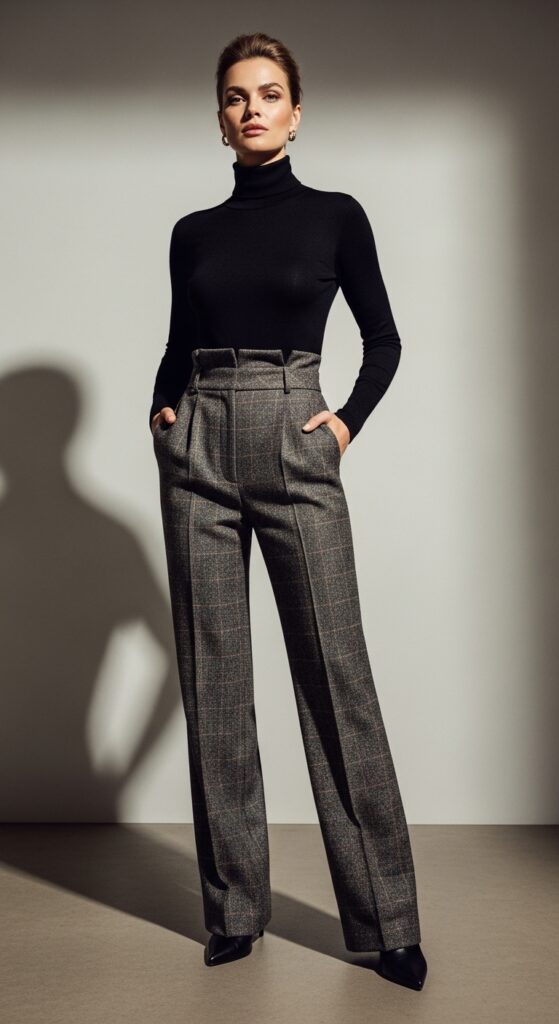 Go for a thin merino wool or cashmere turtleneck in black, burgundy, or navy. The sleekness of the turtleneck balances the texture of the tweed perfectly. Tuck it in fully to show off the waistline of your trousers (especially if they’re high-waisted, which, let’s be honest, they should be).