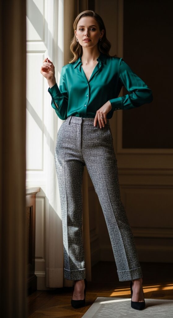 Choose a silk blouse in jewel tones like emerald, sapphire, or ruby for fall and winter. Or go classic with ivory or blush pink. Let the blouse drape naturally, maybe doing a slight front tuck to define your waist without looking too rigid.