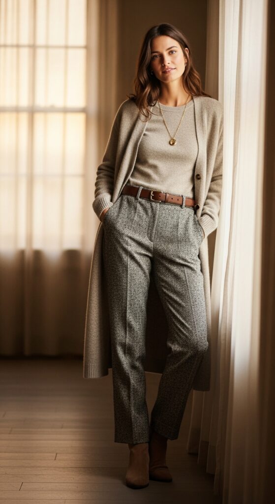 Cardigans are having their renaissance, and pairing one with tweed trousers is pure genius. Go for a long, oversized cardigan in a neutral tone like oatmeal, grey, or camel. The flowy cardigan balances the structure of the trousers perfectly.