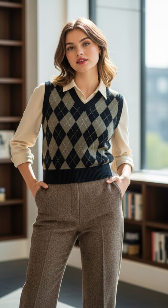 Sweater vests are back, baby, and they’re perfect with tweed trousers. This preppy-chic combination gives off major academic vibes in the best way possible. Think dark academia meets modern fashion.