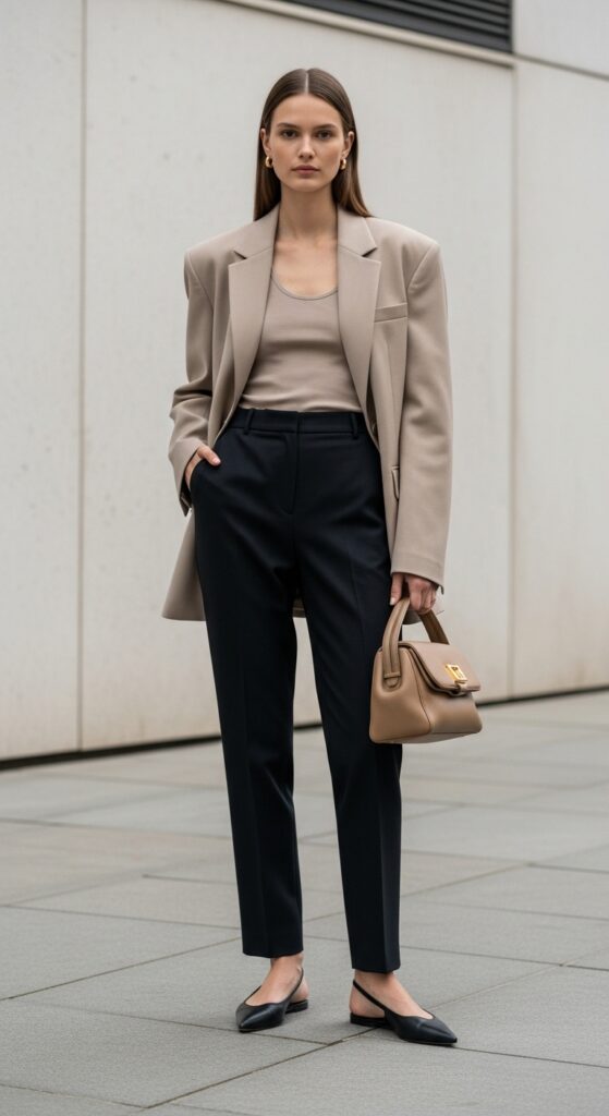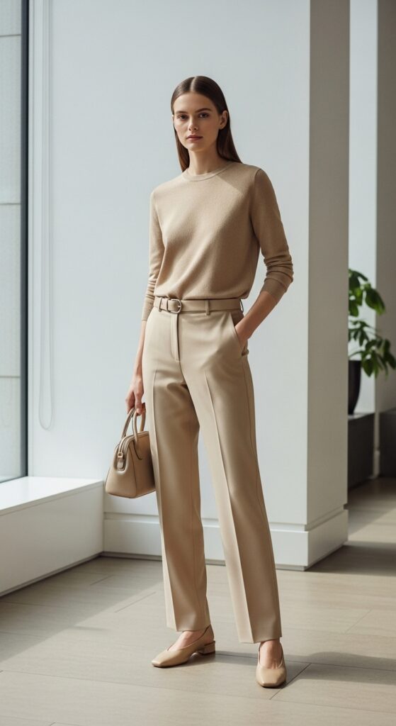 Go for neutral tones like beige, grey, or cream for that monochrome minimalist aesthetic. Add some pointed-toe flats or mules and maybe a structured handbag if you’re feeling fancy. The beauty of this outfit? It works for the office, a dinner out, or even a gallery opening if that’s your thing. Plus, you can literally throw this on in five minutes and still look like you planned it for hours. Sometimes the best outfits are the easiest ones, you know?