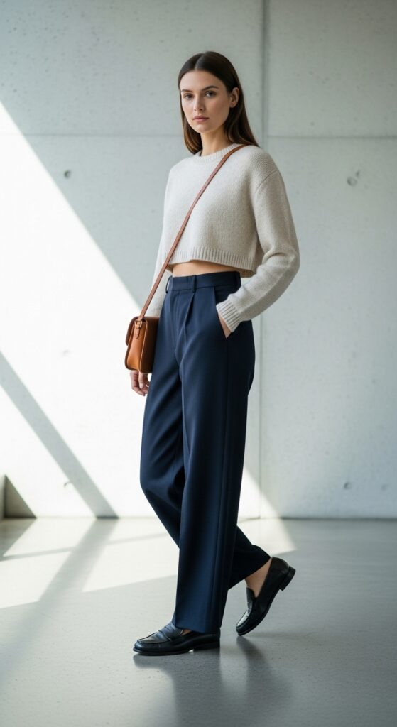 Stick to neutral colors and simple textures to keep it clean. Add loafers or mules and maybe a crossbody bag. The cropped sweater trick is one of those styling hacks that makes you look like you know what you’re doing fashion-wise. It’s all about showing just a hint of waist without showing too much skin. It’s balanced, it’s chic, and it’s way easier to pull off than it sounds.