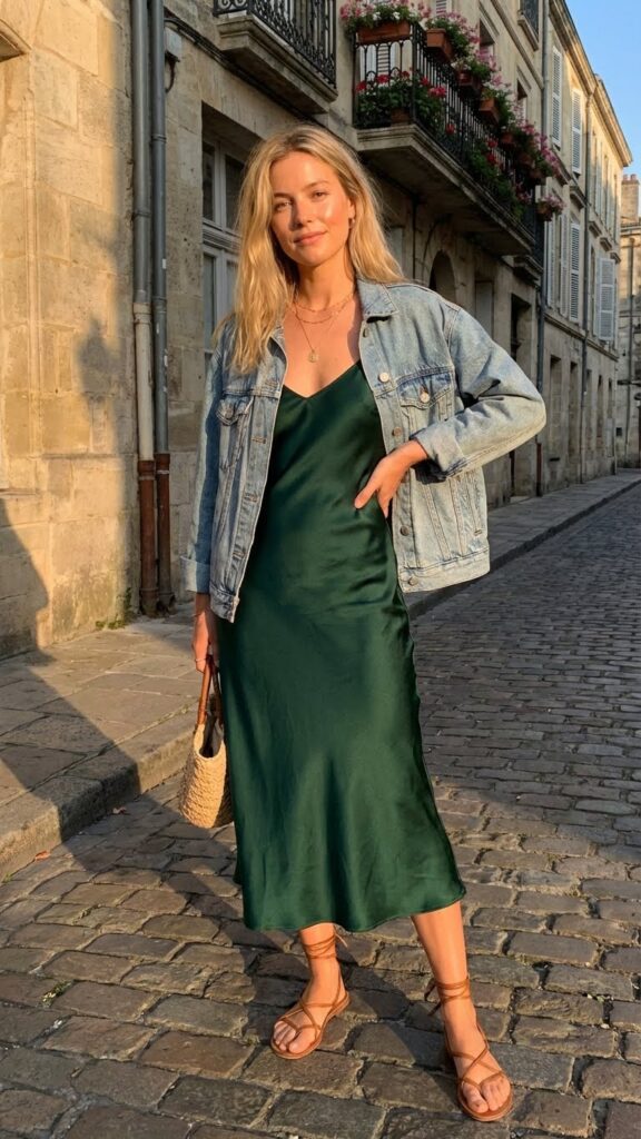 The beauty of this combo is in the contrast. That smooth, flowy fabric against structured denim creates visual interest without you having to think too hard about it. Go for a midi-length slip in a solid color, jewel tones work incredibly well here, and add your favorite denim jacket. The one you’ve worn a million times and feels like a hug? Perfect.