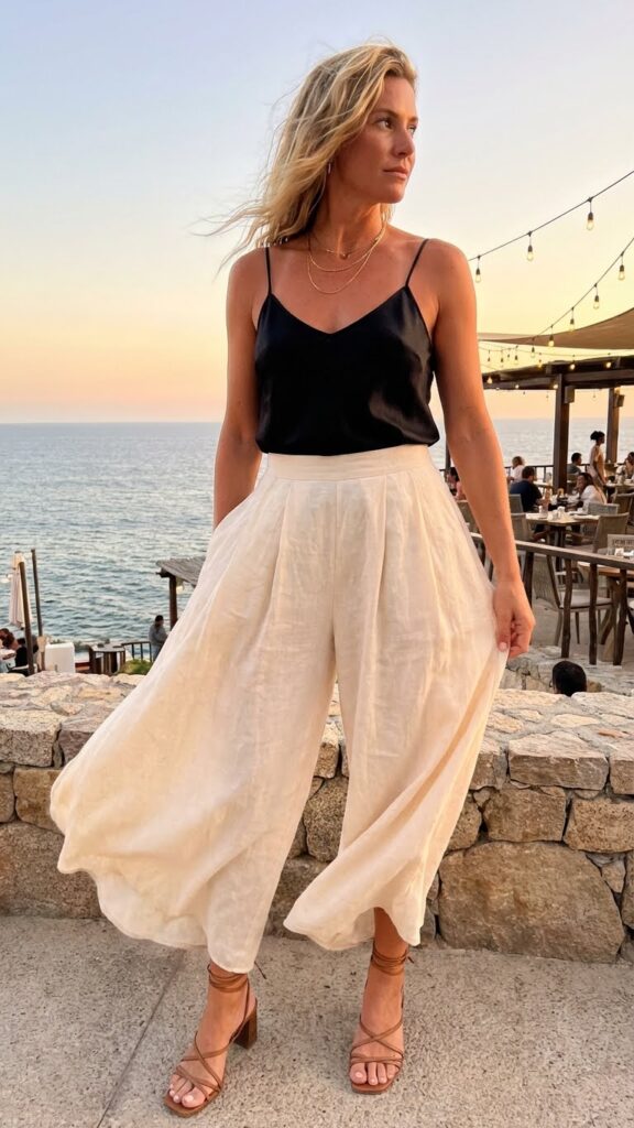 This outfit is all about the fabrics and the flow. You want lightweight materials that move with you. Add some wedges or heeled sandals to avoid the pants dragging on the ground (unless you’re into that, no judgment). Layer on some delicate necklaces, add a clutch, and you’re ready for dinner by the water or in the city. It’s comfortable enough to wear for hours but stylish enough to turn heads.