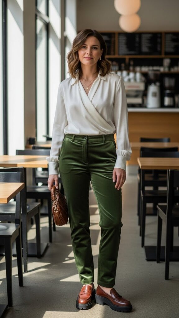 Here’s the thing about silk and velvet together: it sounds like too much texture, but it’s actually magic. A flowy silk blouse in cream or blush softens the richness of velvet trousers while keeping everything elevated.