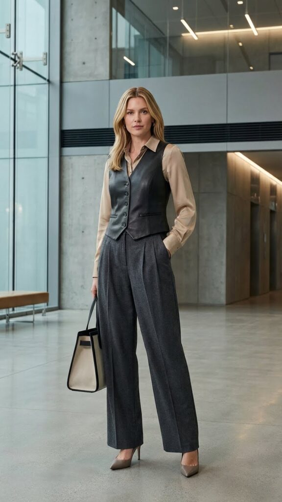 Keep the leather vest fitted and pair it with wide-leg pleated trousers in a neutral tone. A simple blouse or mock-neck top underneath maintains that professional foundation while letting the leather make its statement. This look works especially well in darker colors—think black, burgundy, or deep forest green.