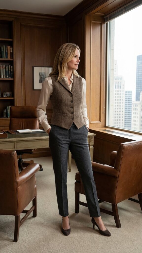 Choose a solid-colored vest—black or camel works beautifully—and pair it with a printed or textured midi dress. The vest essentially acts as a frame, pulling the whole outfit together. Add ankle boots or kitten heels, and you’ve got a look that transitions seamlessly from desk to dinner.