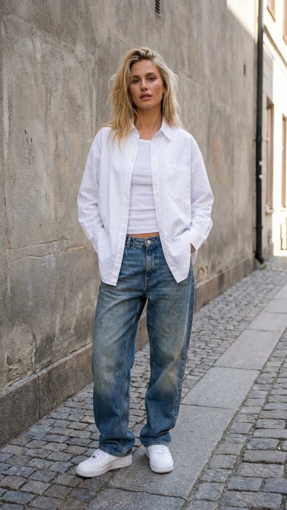 Sometimes the simplest outfits hit the hardest, and this is proof. Grab your favorite vintage baggy jeans (bonus points if they’re light wash with a little distressing) and tuck in a crisp white tee. Do the half-tuck thing where it looks casual but intentional, you know what I mean?