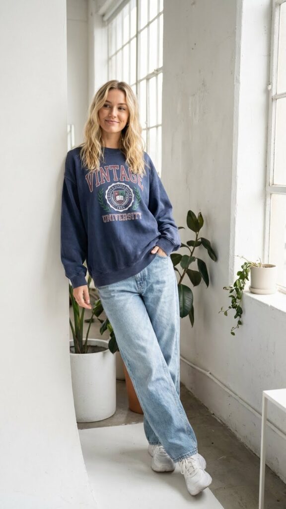 Sometimes you just want to be comfortable, and that’s where the oversized graphic sweatshirt comes in. Pair it with baggy jeans and you’ve got maximum coziness with actual style points. This isn’t sloppy, it’s intentionally relaxed, and there’s a difference.