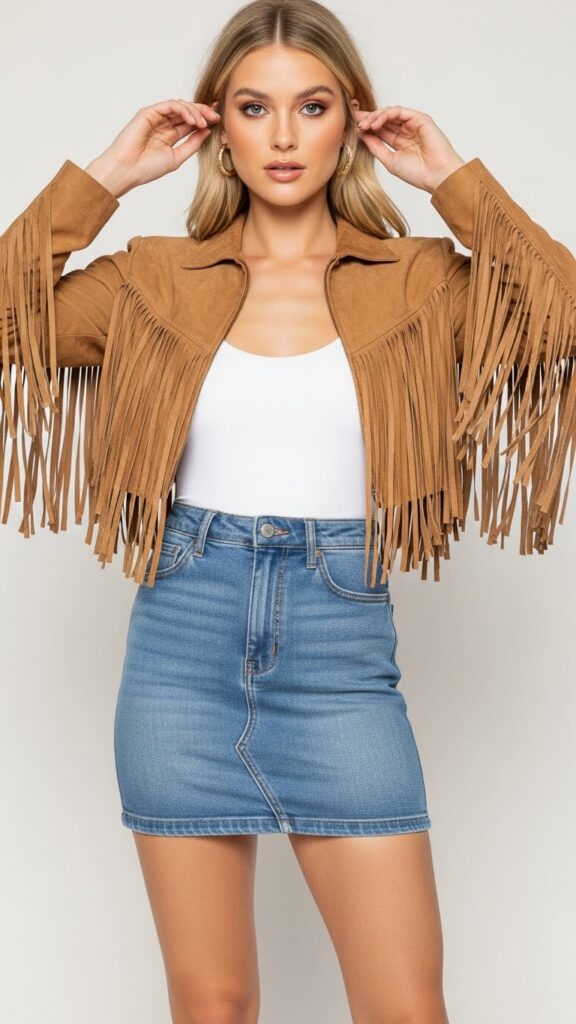 Pick a medium wash denim skirt that hits mid-thigh and throw on a cropped fringe jacket in tan or cream. The movement from the fringe adds drama without trying too hard. Underneath, keep it simple with a fitted white tank or bodysuit.