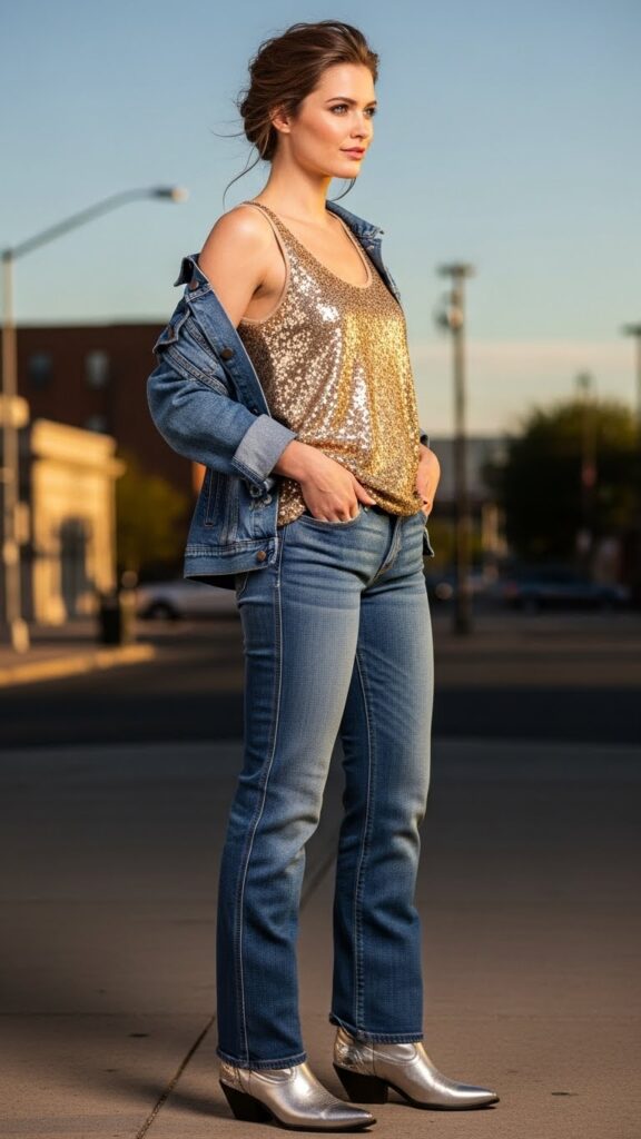 Try a gold sequin tank tucked into your favorite western-cut jeans. Or wear a sparkly bodysuit under a denim jacket. The combination feels fresh and unexpected, perfect for evening western parties where you want to stand out.