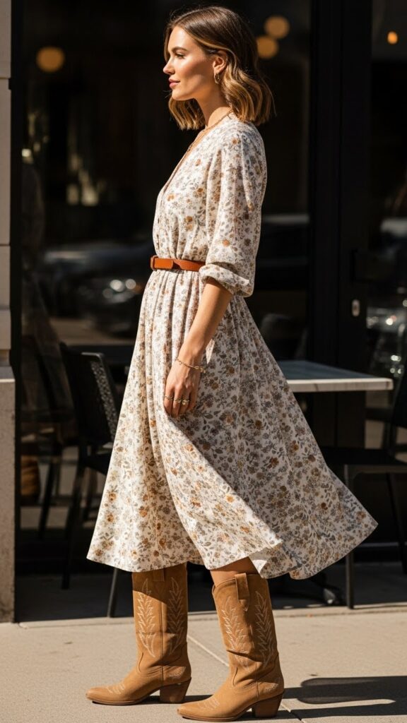 Go for a dress with some western flair, like a floral prairie print or something with subtle ruffles. The key is choosing boots that hit mid-calf and have some personality. Tooled leather, a pop of turquoise inlay, or classic tan suede all work beautifully.