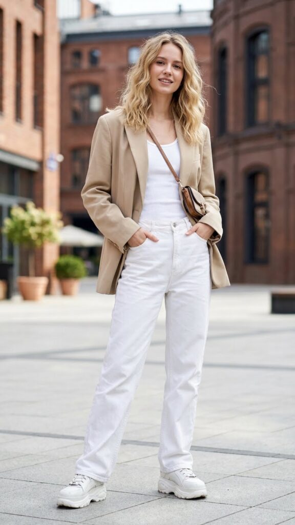 Want to look like you just walked off a street style blog? This is your outfit. The oversized blazer over white baggy jeans combo is chef’s kiss for creating that relaxed-meets-refined aesthetic everyone’s obsessed with right now. Go for a neutral blazer in beige, grey, or even black for maximum versatility.
