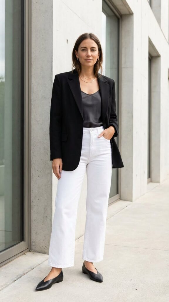 Pointed-toe flats in black or nude elongate your legs (because proportions matter, people) and keep the look polished without going full corporate. This outfit works for business casual offices, client meetings where you want to seem cool and competent, or literally any situation where you need to look like you know what you’re doing. Wear a simple blouse or sleek tee underneath—nothing that competes with the blazer. Minimal jewelry keeps things clean and intentional. This is the outfit that makes people take you seriously while you’re secretly wearing the comfiest jeans in your closet. Everyone wins.