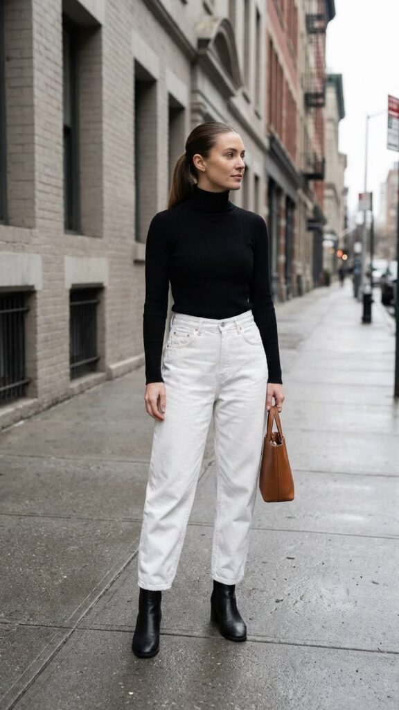 When the temperature drops but you still want to serve looks, this outfit has your back. A fitted turtleneck tucked into white baggy jeans is that perfect blend of sleek and comfortable. The form-fitting top balances the looser silhouette of your jeans, creating a shape that’s both flattering and modern.