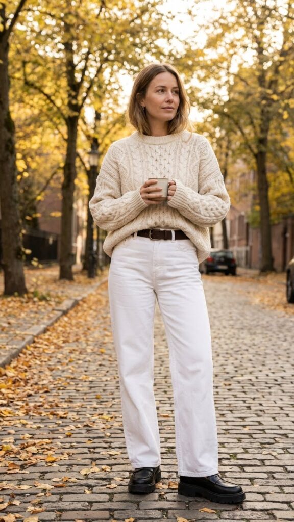 Cozy meets elevated in this outfit that’s perfect for transitional weather. An oversized knit sweater (chunky cable knit or soft cashmere, your choice) paired with white baggy jeans is autumn personified. The sweater brings warmth and texture while your jeans keep the look grounded and modern.