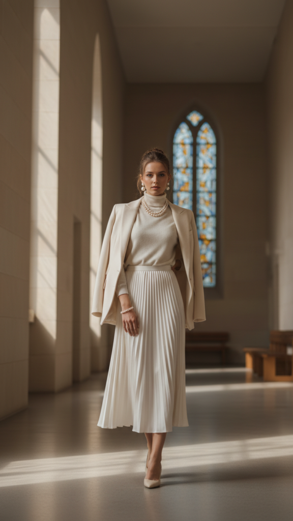 The pleated midi skirt silhouette offers graceful movement while maintaining modesty, making it ideal for worship settings. Your turtleneck fabric choice determines comfort and style—consider luxurious cashmere for cooler months or breathable cotton blends for warmer weather. This pairing creates clean lines that flatter various body types.