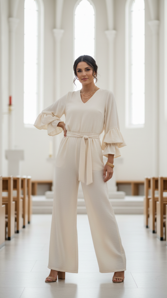 When you want to make a bold yet appropriate statement at church, a chic white jumpsuit with long sleeves and wide legs delivers sophisticated elegance in one streamlined piece. Choose styles featuring ruffled sleeves for feminine charm that adds visual interest without overwhelming your silhouette. The customized waist creates definition while maintaining modesty through full coverage.