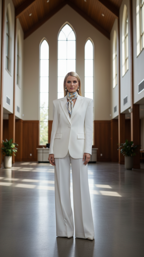 A white sweater twin set with coordinating dress pants offers timeless sophistication that never goes out of style for church services. You’ll love how this monochromatic white outfit creates seamless elegance while maintaining comfort throughout lengthy services. Choose wide leg white pants to balance the fitted cardigan silhouette perfectly.
