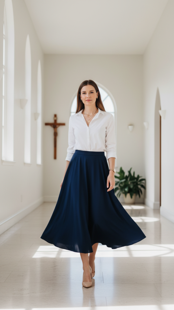 Choose a flowy a line skirt in navy, charcoal, or black for maximum versatility. Midi length works perfectly for church settings, hitting at mid-calf for graceful coverage. Tuck your shirt in completely or try a French tuck for modern flair.