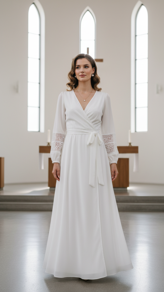 Choose a dress with clean lines and quality fabric that drapes beautifully across your body. The wrap style naturally defines your waist while maintaining modesty through appropriate coverage. While white creates a fresh and clean aesthetic, consider how all-black attire offers an equally timeless and dignified alternative for church services.