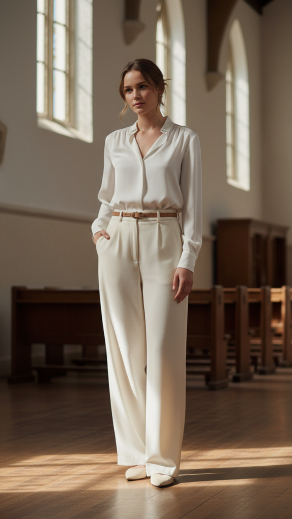 Wide-leg designs offer comfort during extended services while projecting polished professionalism. Pair with nude block heels and delicate gold jewelry for refined finishing touches. This modern alternative to traditional dresses gives you freedom to move gracefully while expressing your personal style within appropriate church dress codes.