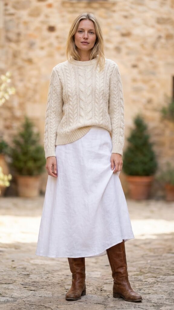 A chunky cable knit sweater paired with leather boots creates the perfect cozy-meets-sophisticated look for your white maxi skirt this winter. Brown leather adds warmth, while black creates dramatic contrast.