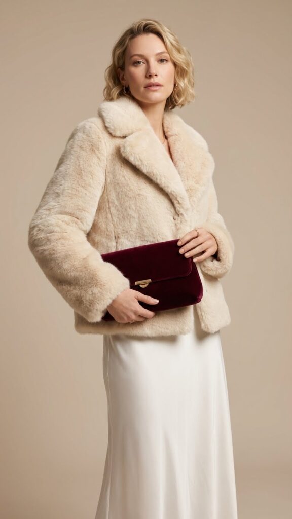 Pairing a luxurious faux fur coat with velvet accessories alters your white maxi skirt into a show-stopping winter ensemble. Choose a vegan faux fur option in cream or blush tones to create a cohesive, graceful look that reflects your values.