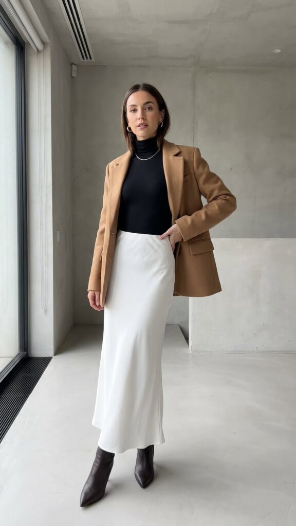 You’ll love how this outfit converts from office meetings to evening dinners. Choose neutral blazer tones like camel, charcoal, or black to complement your white skirt. Add pointed-toe boots and minimal gold jewelry to complete this refined winter look.