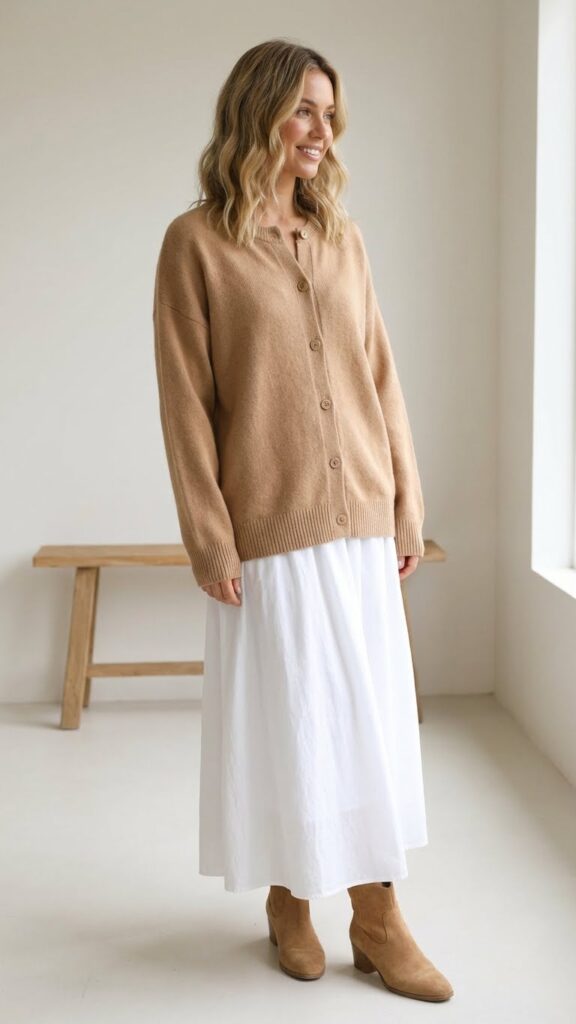 Choose a cardigan in neutral tones like camel, gray, or black to complement your white skirt’s classic silhouette. You’ll appreciate how this combination moves freely with your body throughout the day. Long skirt winter outfit ideas are perfect for warmth and elegance.