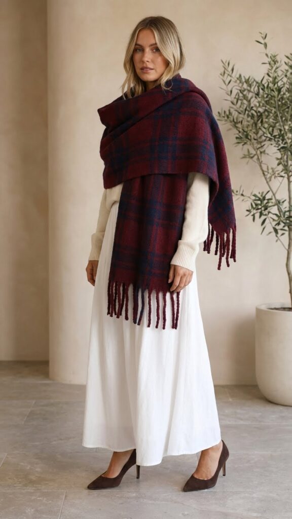 Choose plaids featuring burgundy, forest green, or navy to complement your crisp white base. Wrap the scarf loosely around your shoulders or let it cascade down your front for maximum impact.