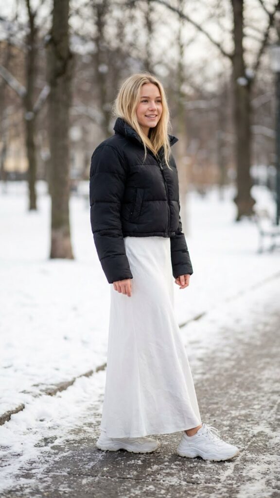 A cropped puffer jacket alters your white maxi skirt into the perfect casual winter outfit. This combination lets you move freely while staying warm yet stylish throughout your day. The cropped length hits right at your waist, creating a flattering silhouette that doesn’t overwhelm the skirt’s graceful flow.