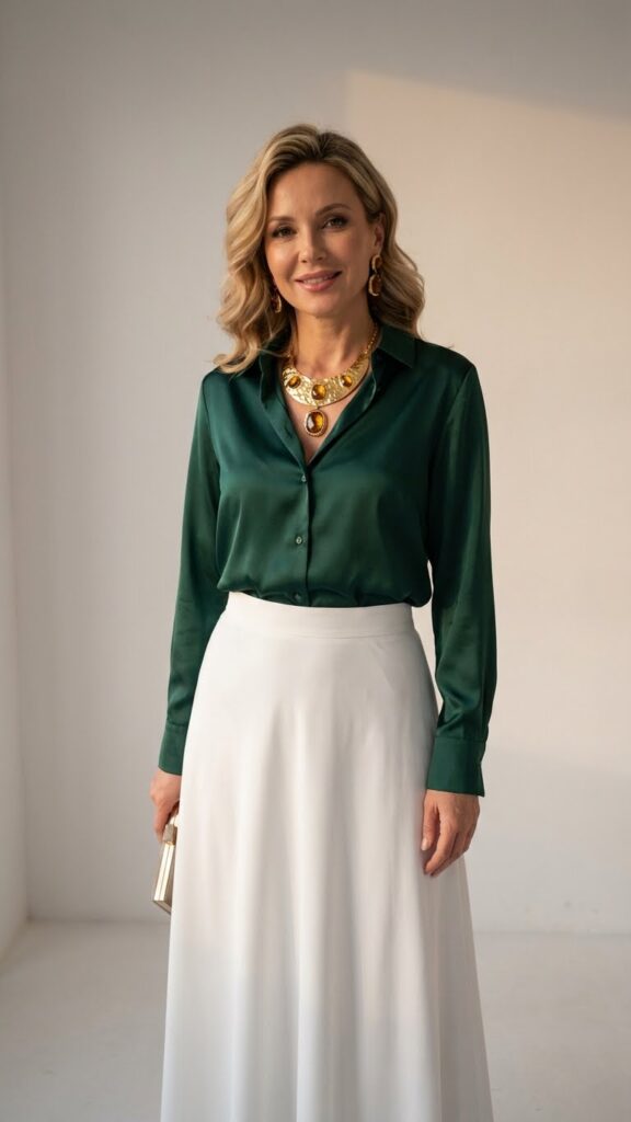 You’ll want to tuck your blouse in at the waist to define your silhouette and showcase the skirt’s graceful drape. Choose jewel tones like emerald, burgundy, or sapphire to create stunning contrast against the white fabric.