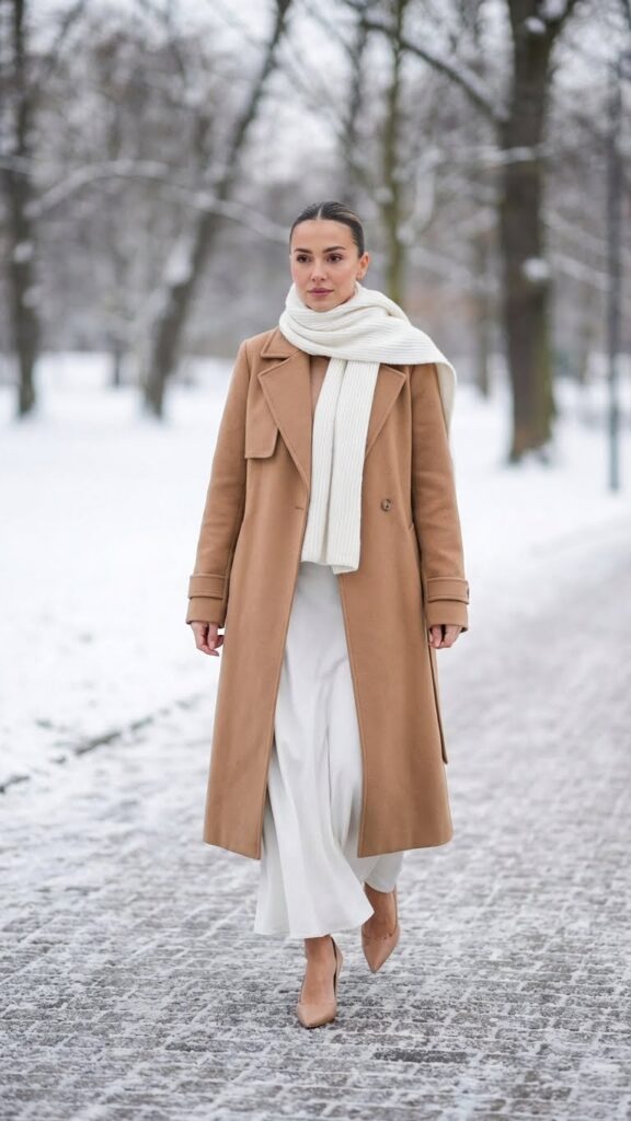 When you’re seeking effortless winter elegance, a longline trench coat paired with classic pumps alters your white maxi skirt into a timeless ensemble. The structured silhouette of a camel or navy trench creates beautiful contrast against flowing white fabric. You’ll love how this combination moves freely while maintaining polished sophistication.