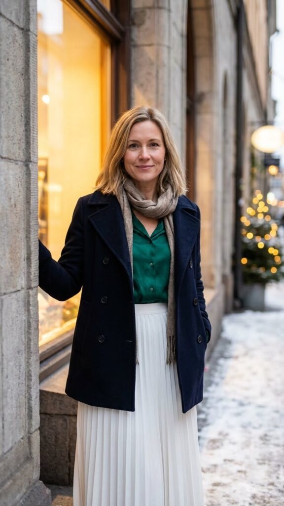 Layer a fitted sweater underneath your jacket for added warmth and dimension. Don’t forget to accessorize with simple gold jewelry and a structured handbag. This combination lets you move freely through winter days while looking effortlessly polished and put-together. Sophisticated winter looks with white skirts can further enhance the elegance of this outfit.