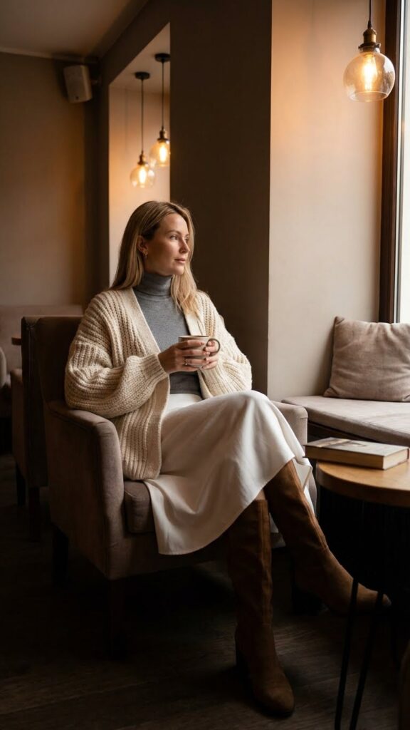 Layer your cardigan open over a fitted turtleneck or belt it at the waist to define your silhouette. This styling trick gives you freedom to adjust your look throughout the day as temperatures change.