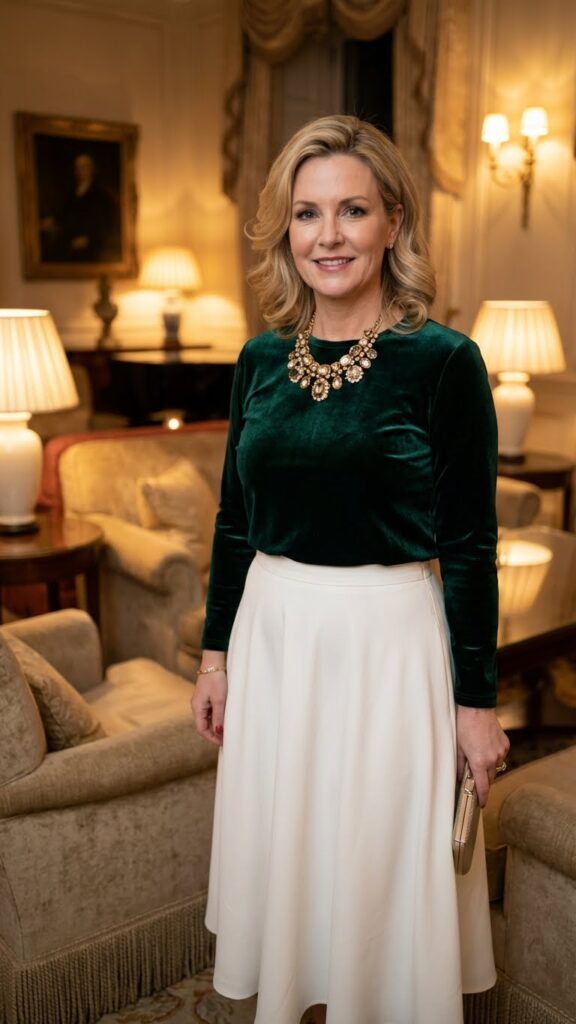 You’ll augment this pairing further by adding a bold statement necklace that draws attention to your neckline. Chunky gold chains or crystal-embellished pieces work particularly well with velvet’s luxurious appearance. Keep your other accessories minimal so your jewelry remains the focal point. This combination gives you the freedom to move seamlessly from holiday parties to romantic dinners while looking effortlessly polished and put-together.