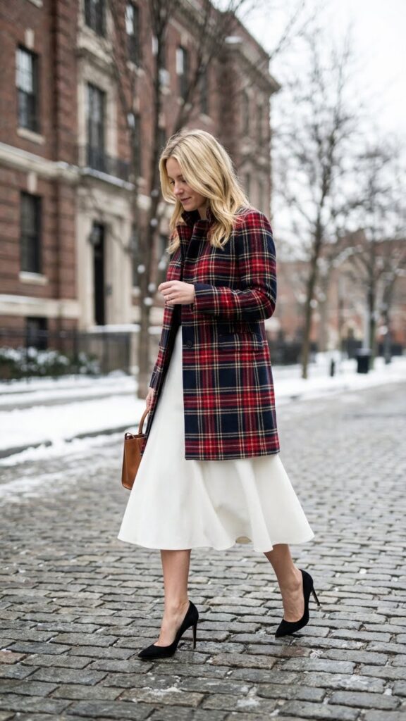 Have you ever wondered how to convert your white midi skirt into a sophisticated winter statement? A plaid coat paired with classic pumps creates an effortlessly polished look that expresses your independent style.