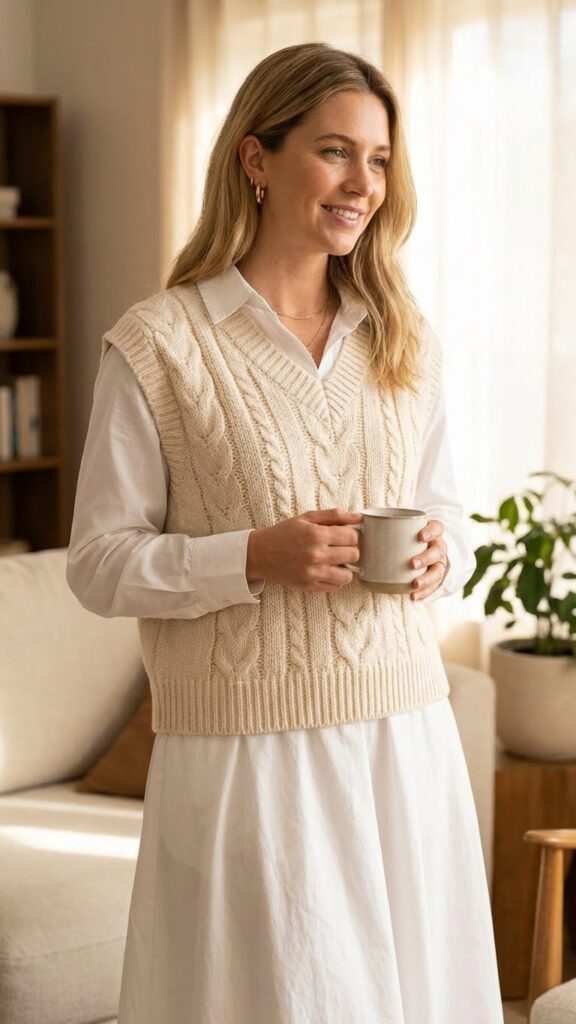 A sleeveless v neck vest adds visual interest without bulk, making it ideal for indoor-outdoor shifts. Choose a textured knit top in cream or ivory to maintain your refined winter white aesthetic. The cable pattern brings dimension to your outfit while keeping you warm.