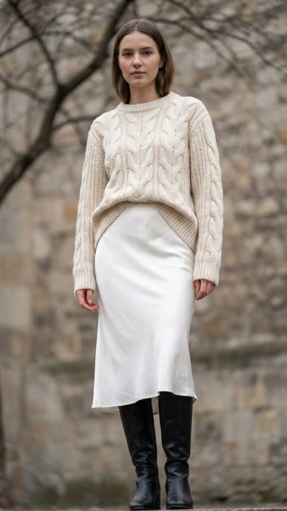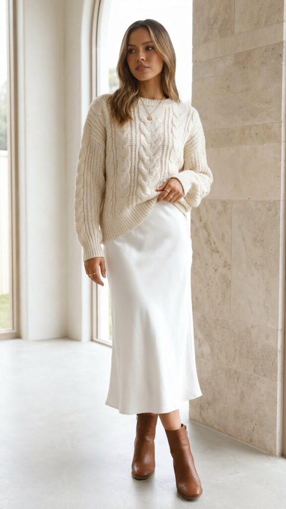 Choose chunky knit sweaters in cream or ivory to complement your white satin skirt beautifully. Pair with ankle boots or pointed-toe heels to complete the outfit. This versatile combination works perfectly for holiday parties, date nights, or upscale brunch gatherings throughout the winter season.