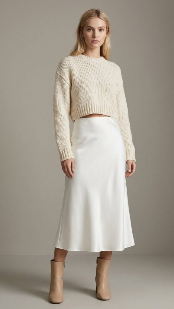 Everyone looking for a flattering winter silhouette should consider the cropped sweater and high-waisted satin skirt combination. This pairing elongates your legs while keeping you cozy during colder months. You’ll love how the high waist accentuates your natural curves.