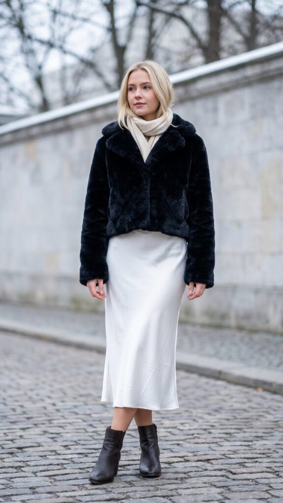 A faux fur coat alters your white satin skirt into a glamorous winter statement that’s both warm and eye-catching. The plush texture contrast between soft fur and smooth satin creates visual interest that enhances your entire look instantly.