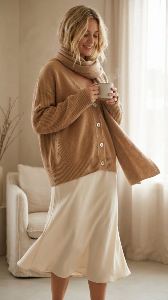 You’ll want to drape an oversized cashmere cardigan over your white satin skirt for effortless movement and warmth. Try layering neutrals like cream, camel, or soft gray cardigans to complement the skirt’s luminous sheen.