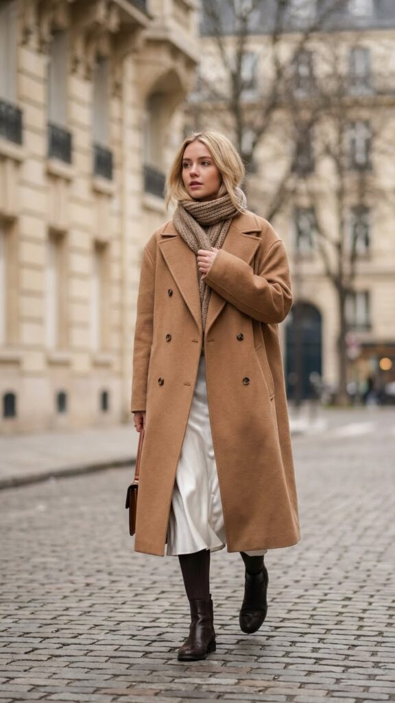 This combination lets you move freely throughout your day while looking polished. You can shift effortlessly from coffee runs to dinner plans without changing. The contrast between cozy wool and luxurious satin creates visual interest that’s effortlessly sophisticated.