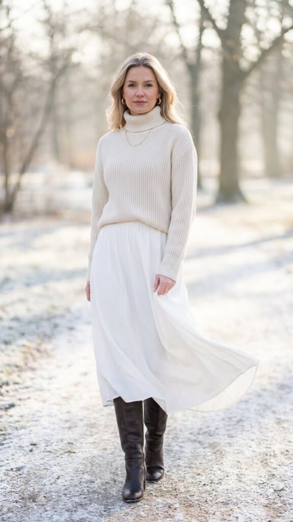 A chunky turtleneck tucked into a flowing maxi skirt creates one of winter’s most effortlessly romantic silhouettes. This combination balances volume beautifully, with the fitted upper portion giving way to graceful movement below.