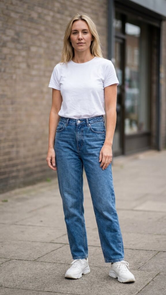 Sometimes the simplest looks hit the hardest, you know? There’s something about a crisp white tee tucked into high-waisted baggy jeans that just screams “I woke up like this” energy. Add your favorite chunky sneakers (bonus points if they’re slightly beat up for that lived-in vibe), and you’ve got yourself an outfit that works for coffee runs, casual Fridays, or literally any day ending in Y.